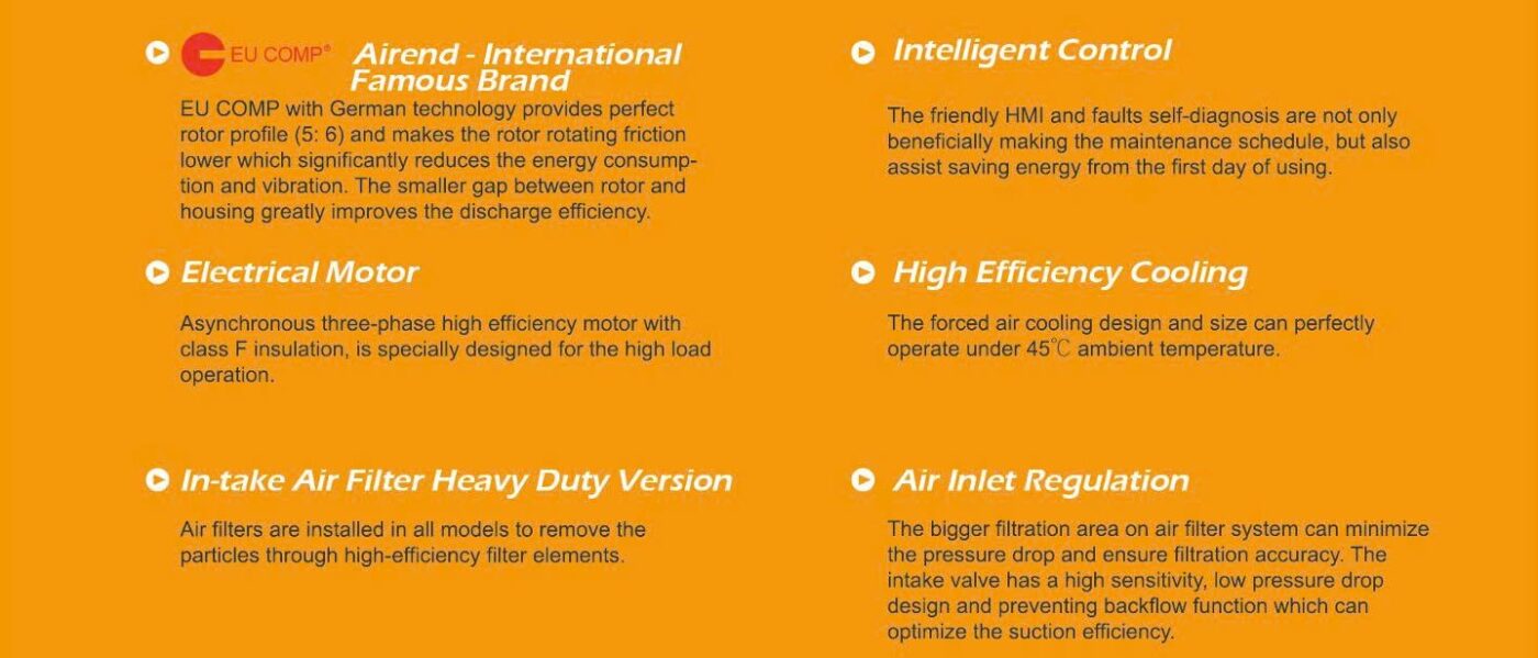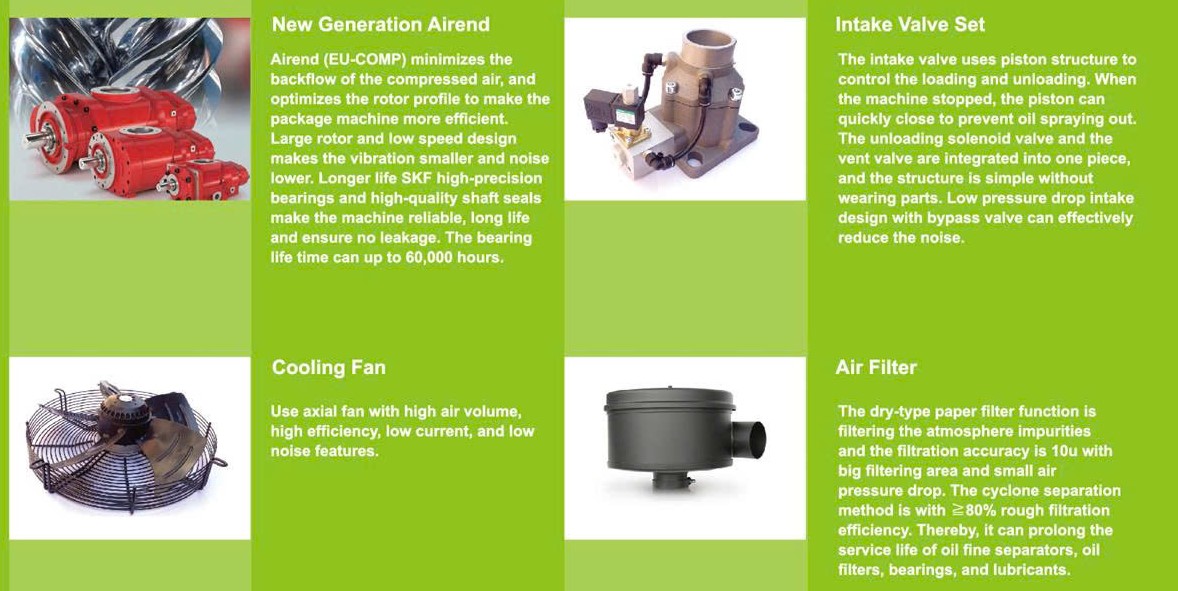 – Sử dụng đầu nén trục vít Eucom thương hiệu số 1 tại Đức, Trục vít có kích thước lớn chạy tốc độ thấp vẫn tạo ra lưu lượng khí lớn (vòng bi trở nên bền bỉ khi chạy tốc độ thấp). Sử dụng vòng bi SKF có thời gian sử dụng tới 60.000h máy chạy