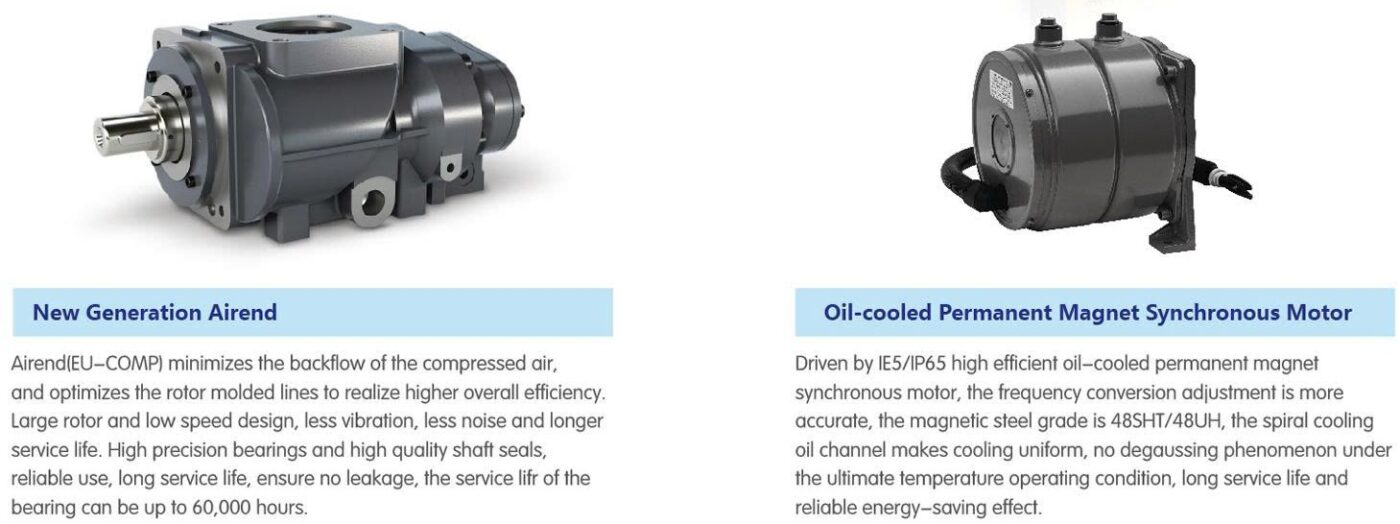 – Máy Nén FirstAir Được điều khiển bởi động cơ đồng bộ nam châm vĩnh cửu làm mát bằng dầu hiệu quả cao IE5/1P65, sử dụng loại thép từ tính là 48SHT/48UH.
